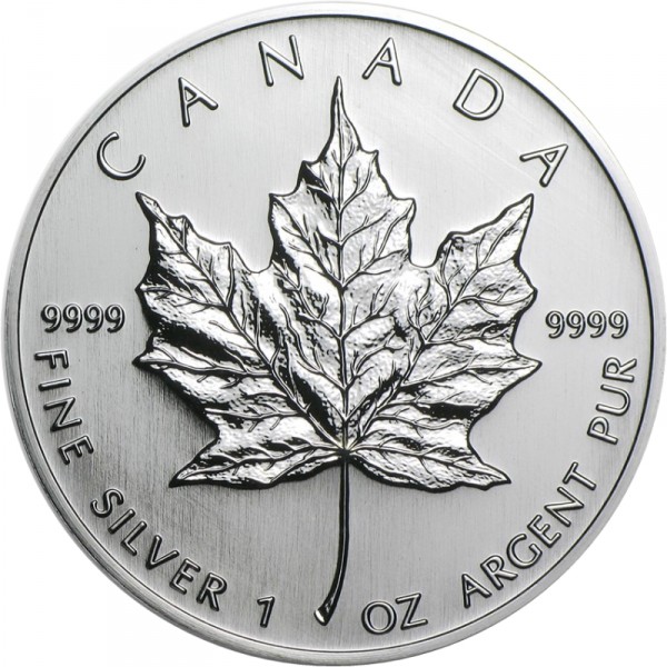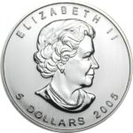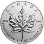 Srebrna moneta Liść Klonu 1 uncja jest produkowana od 1988 r. ma masę 31,103 grama i próbę 999,9/1000 fine silver .